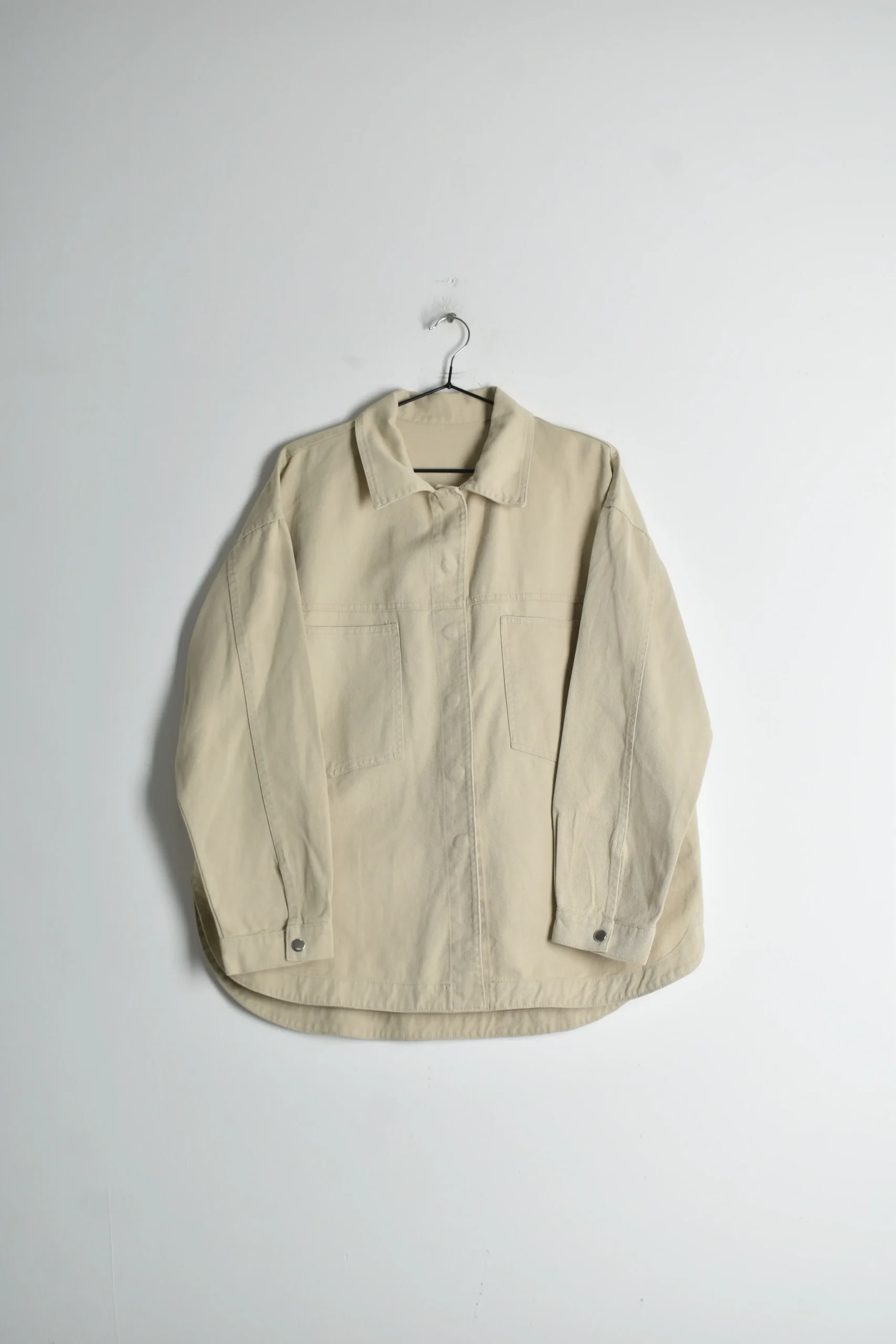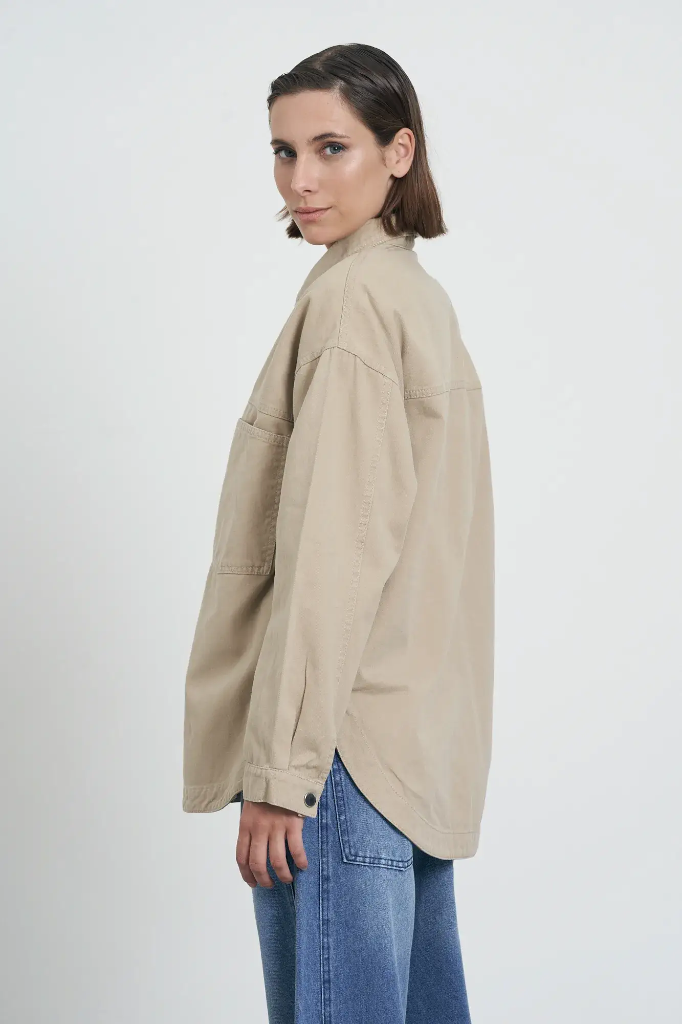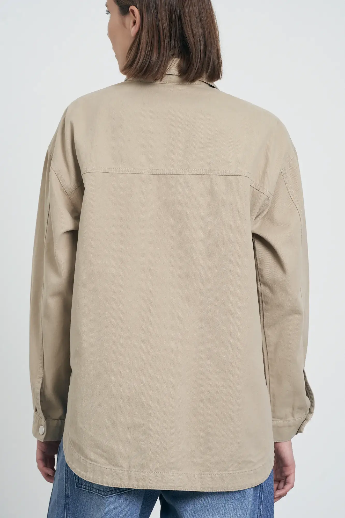 Camisaco de gabardina. Es de calce over, con forma redondeada. Posee botones snap internos.
