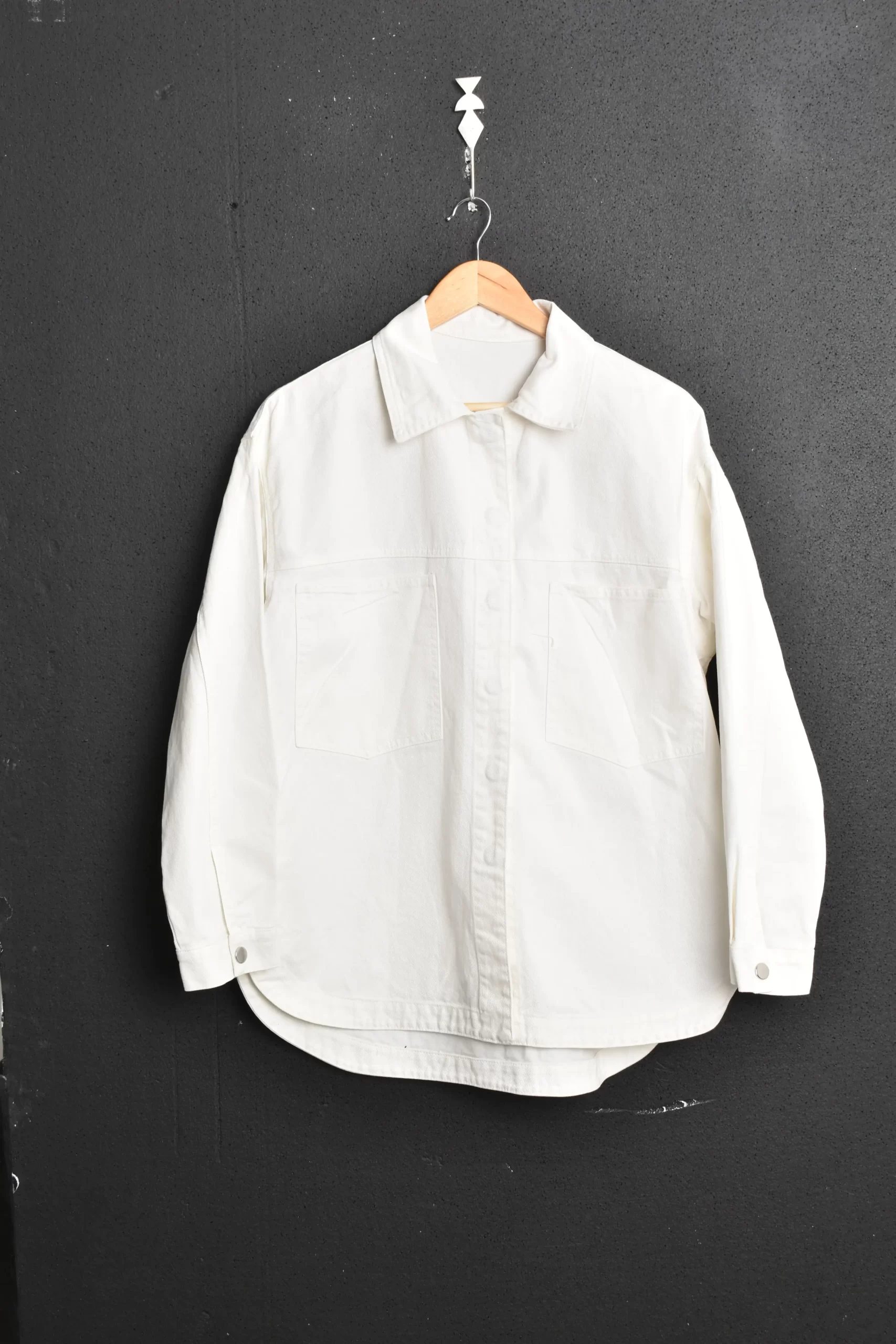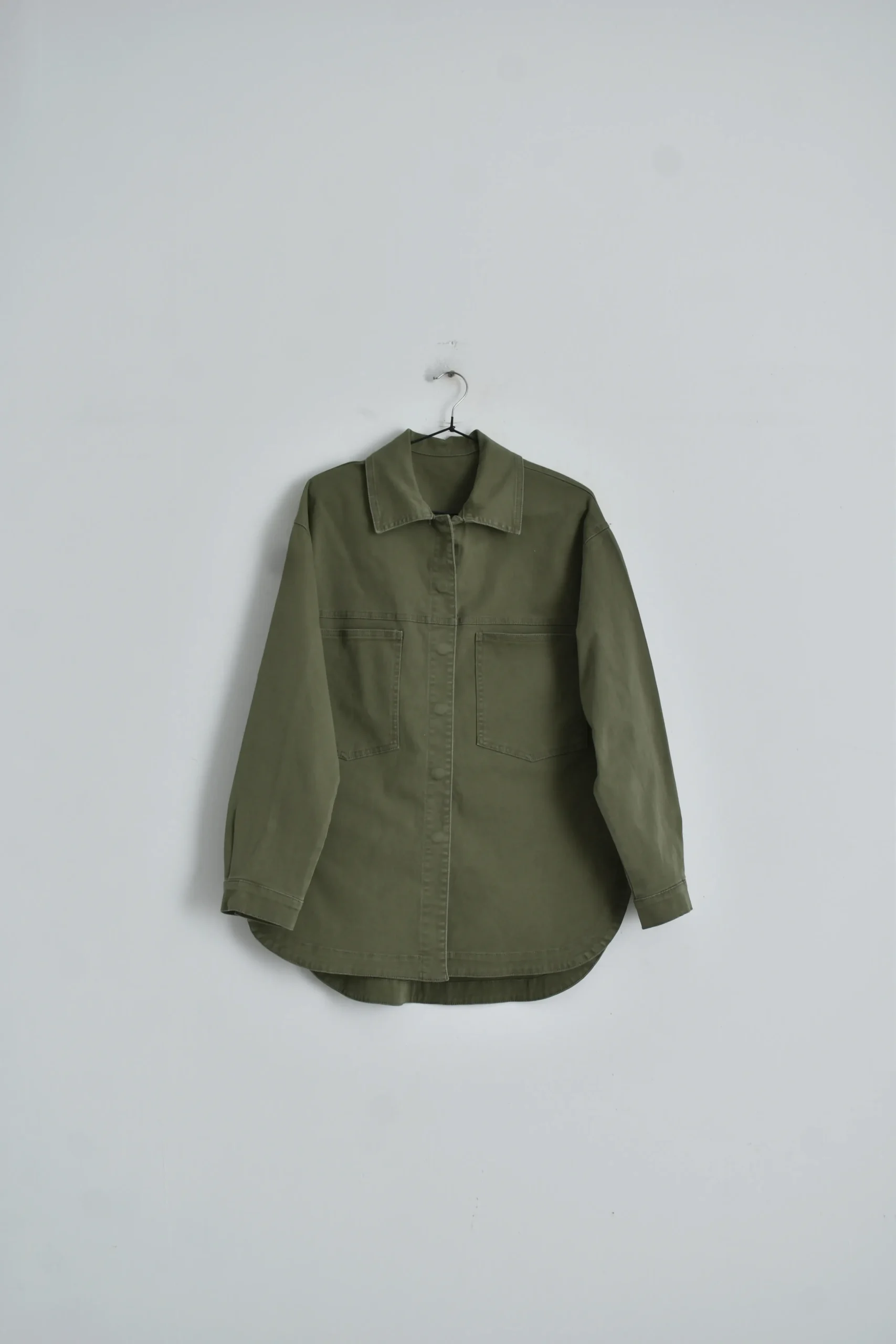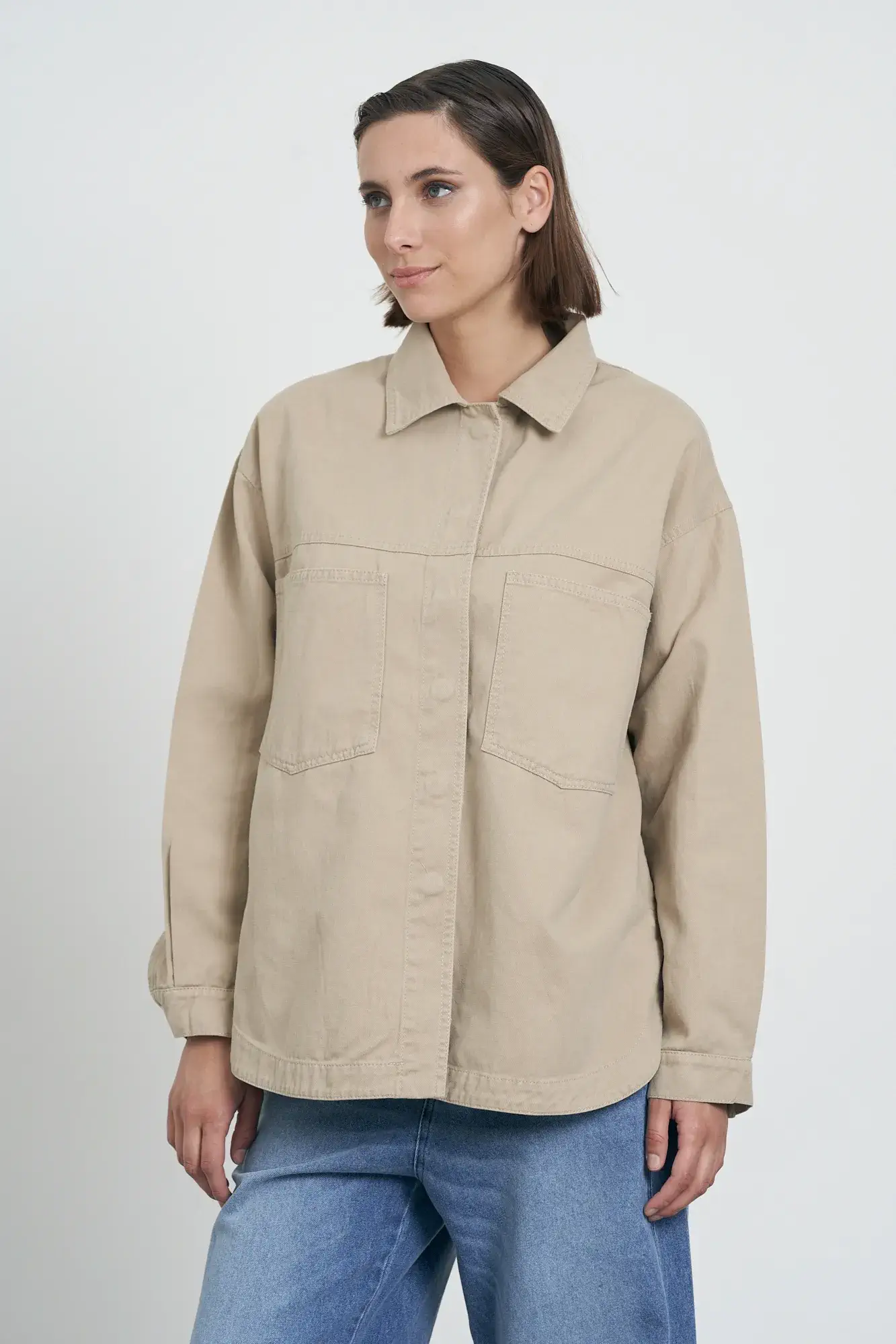 Camisaco de gabardina. Es de calce over, con forma redondeada. Posee botones snap internos.