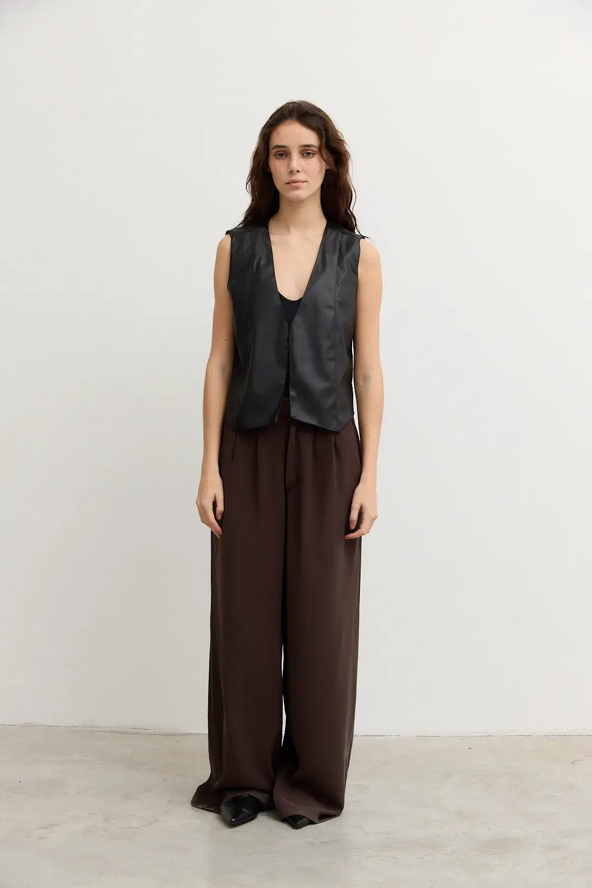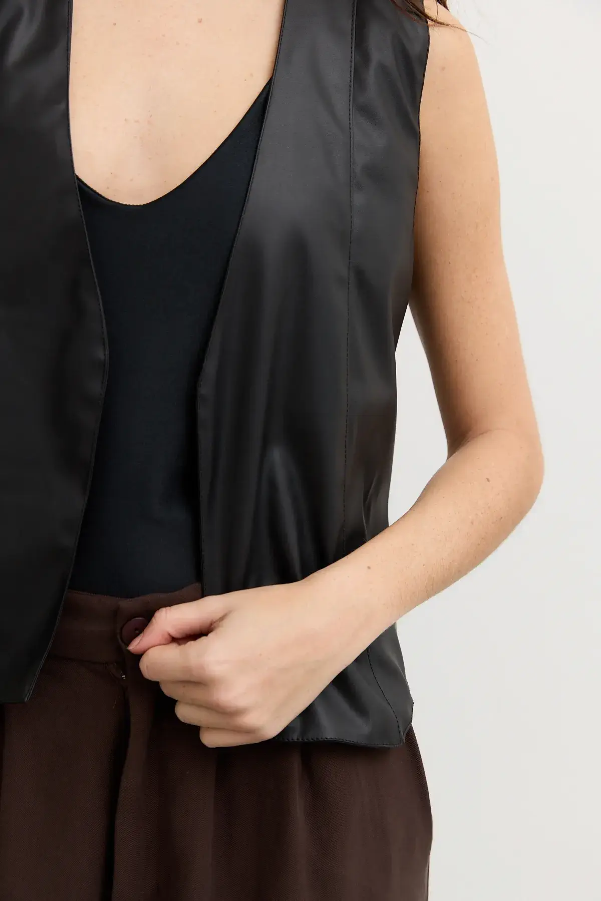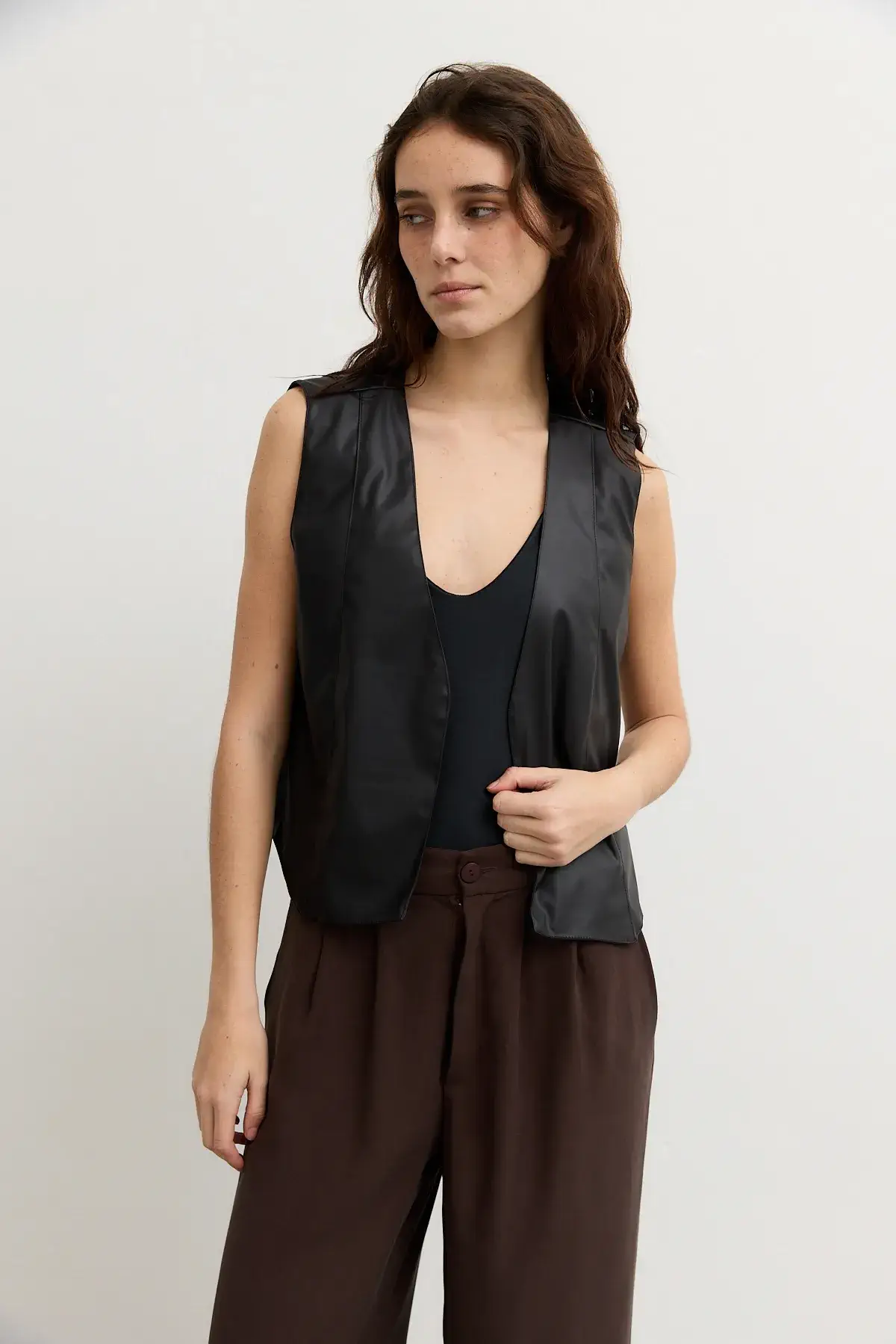 Chaleco de cuerina. Tiene recorte delantero y es de calce entallado. No posee forreria.