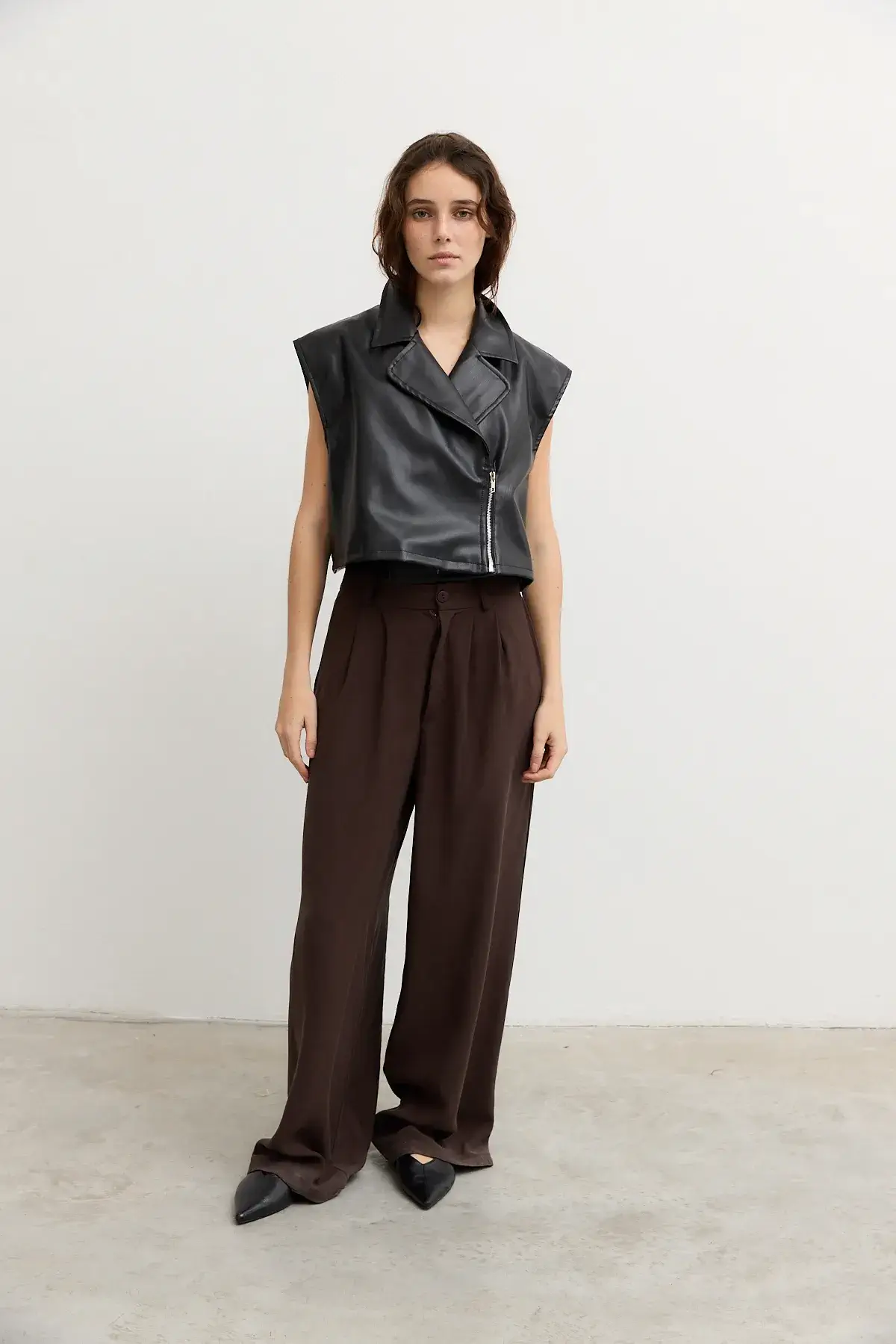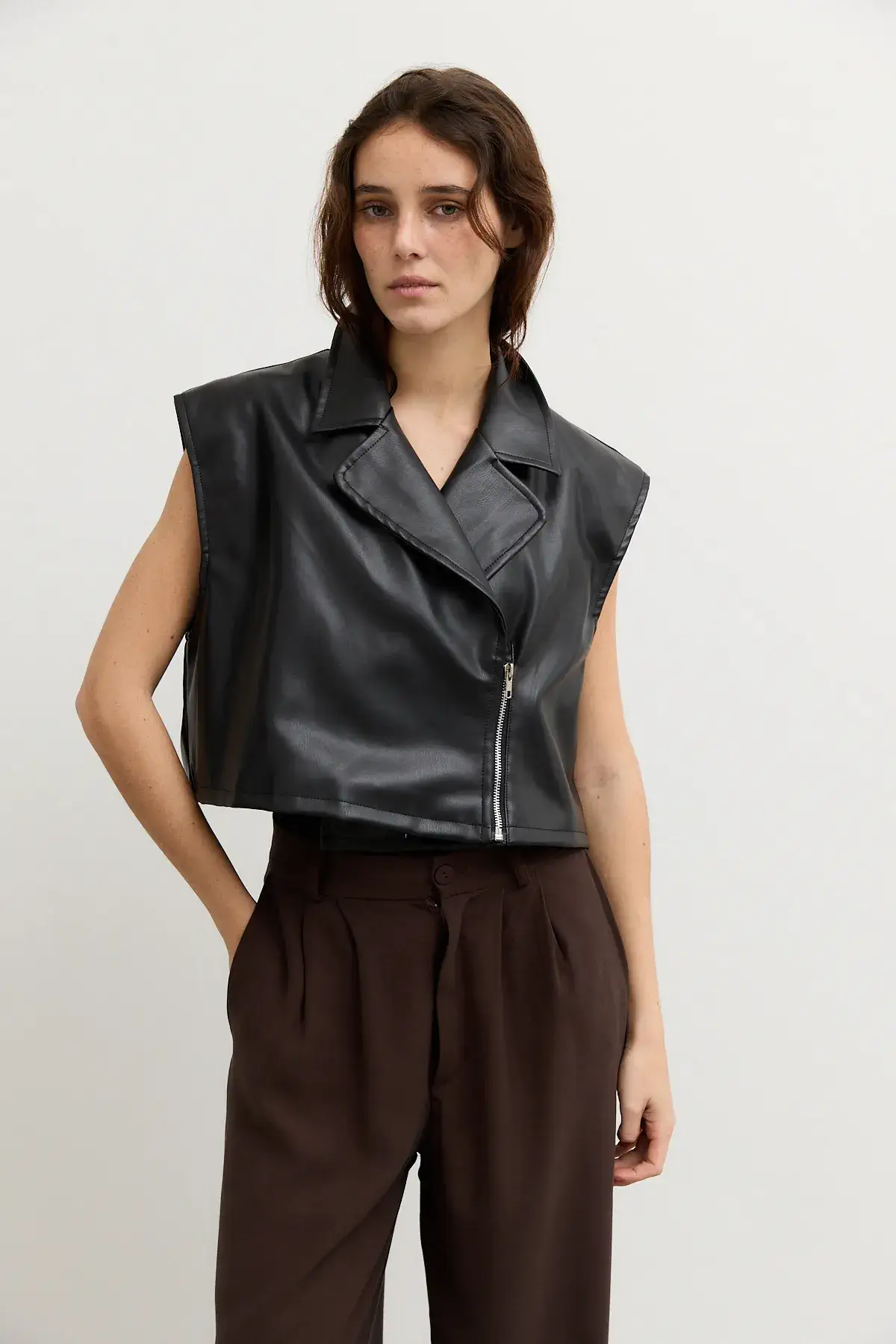 Chaleco de cuerina corte oversize. Tiene cierre metálico y forreria.