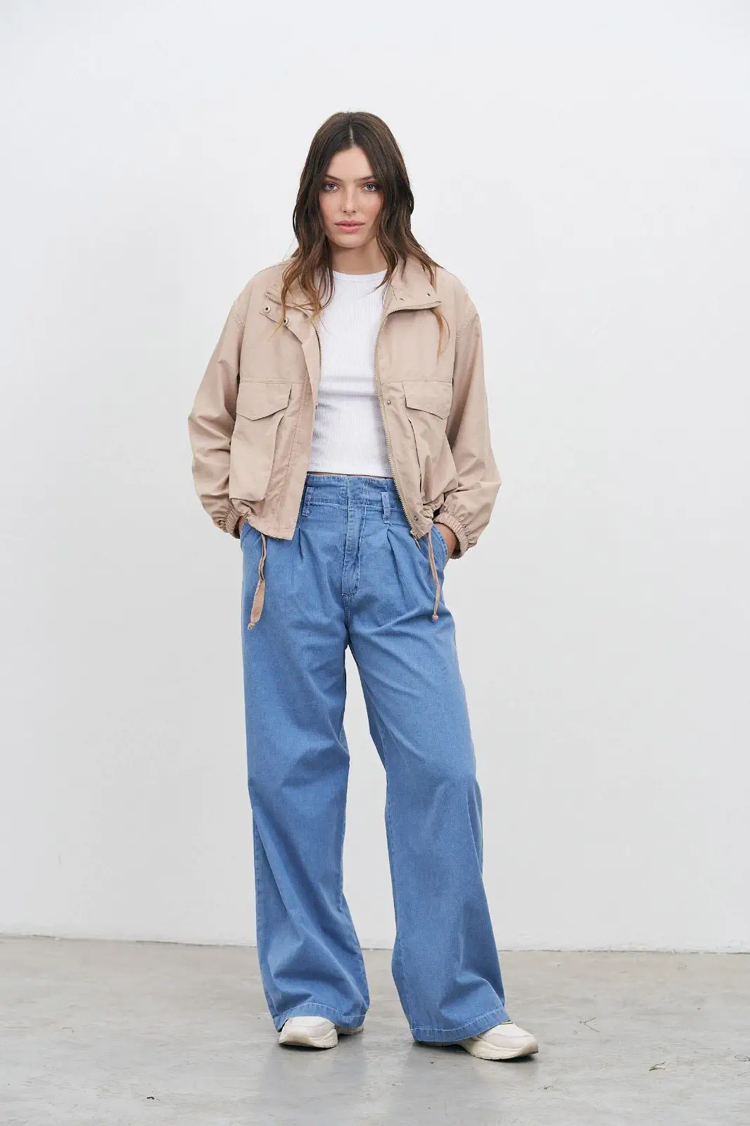 Pantalón ancho pinzado de denim finito con proceso de gastado.