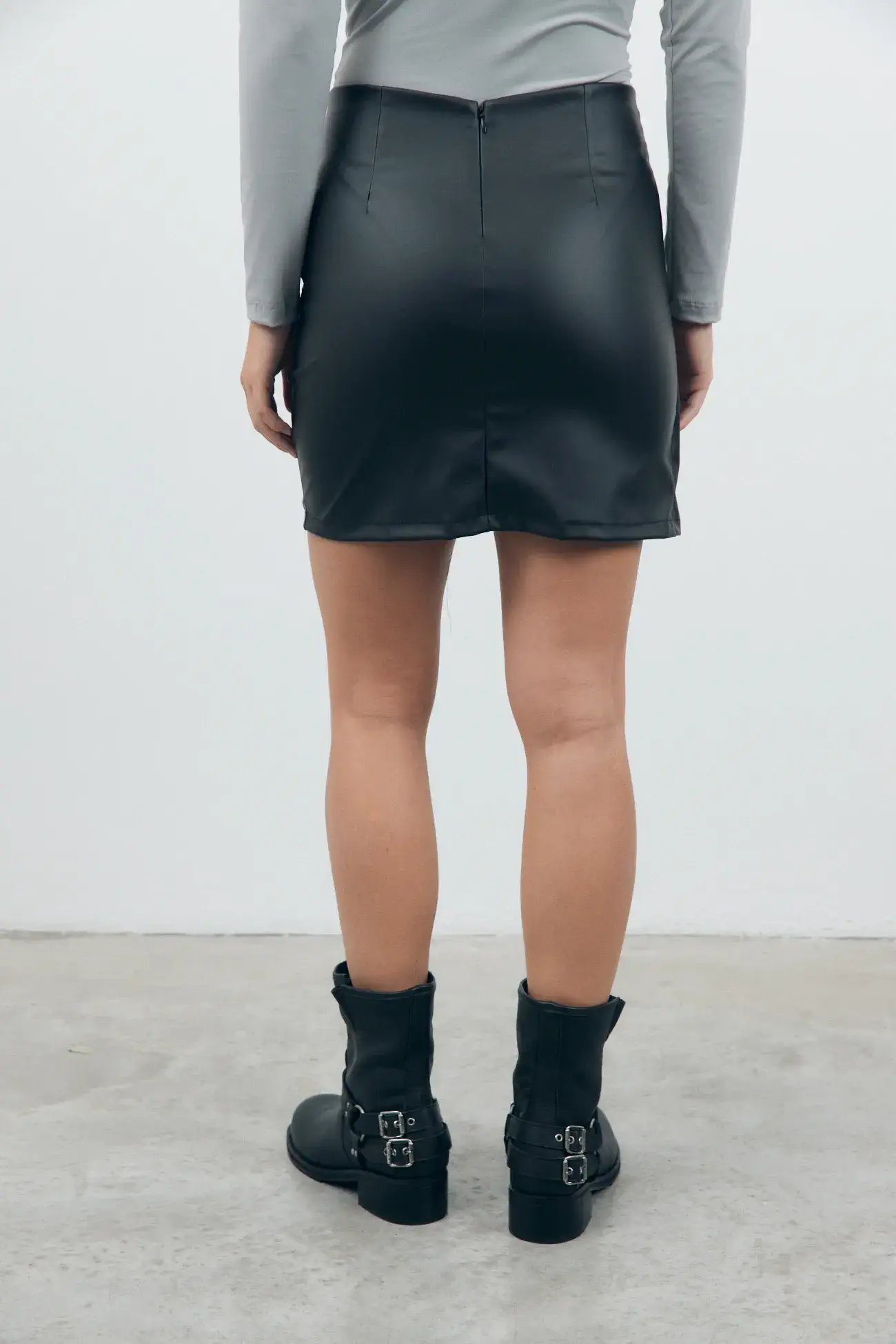 Pollera de eco cuero con recorte en la cadera irregular. Tiene tachas peltre cuadrada y tajo delantero.
