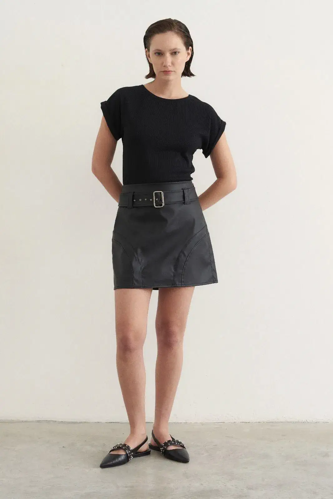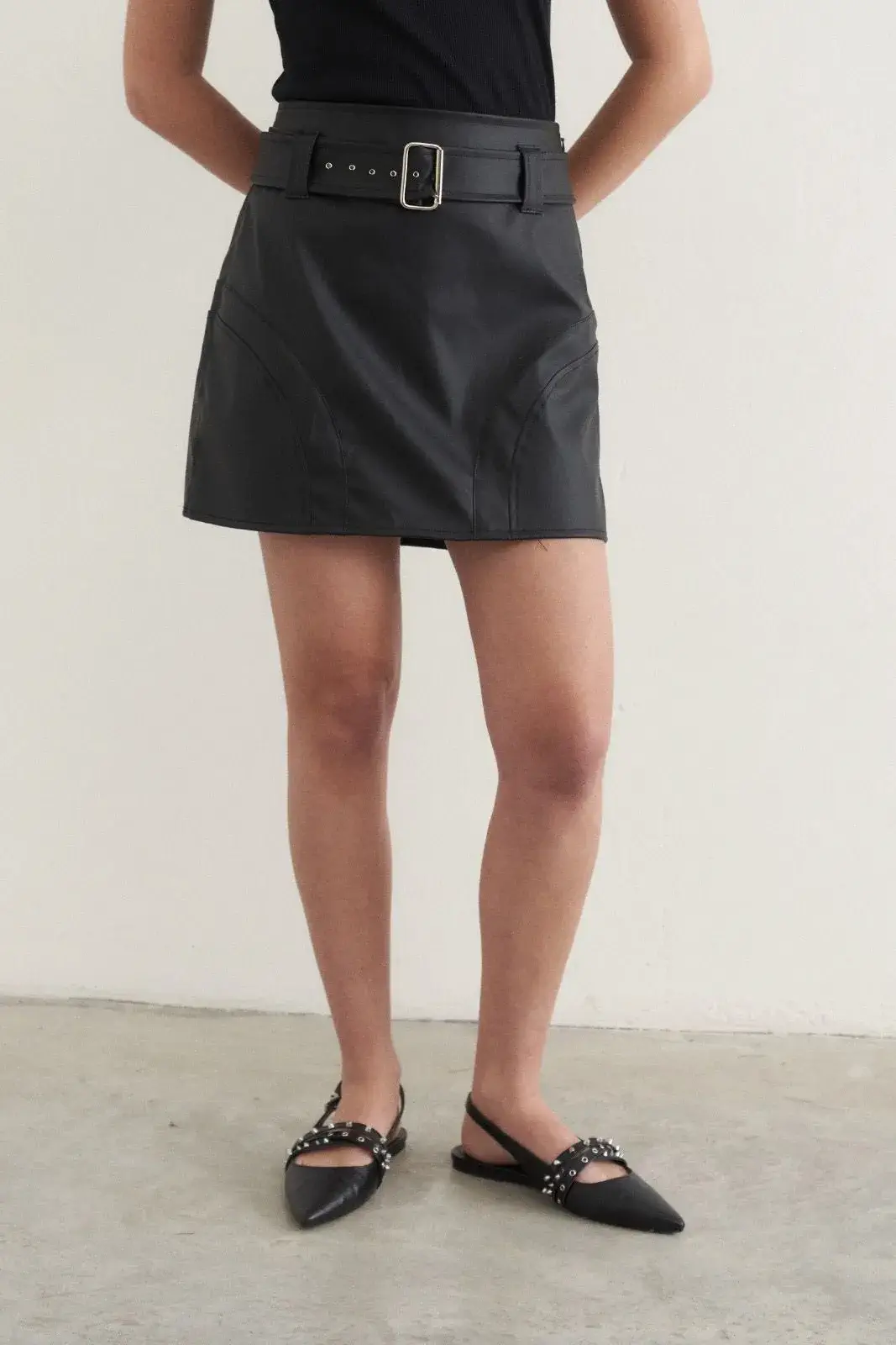 Pollera de cuerina. Tiene recortes laterales y cinturón con hebilla metálica.