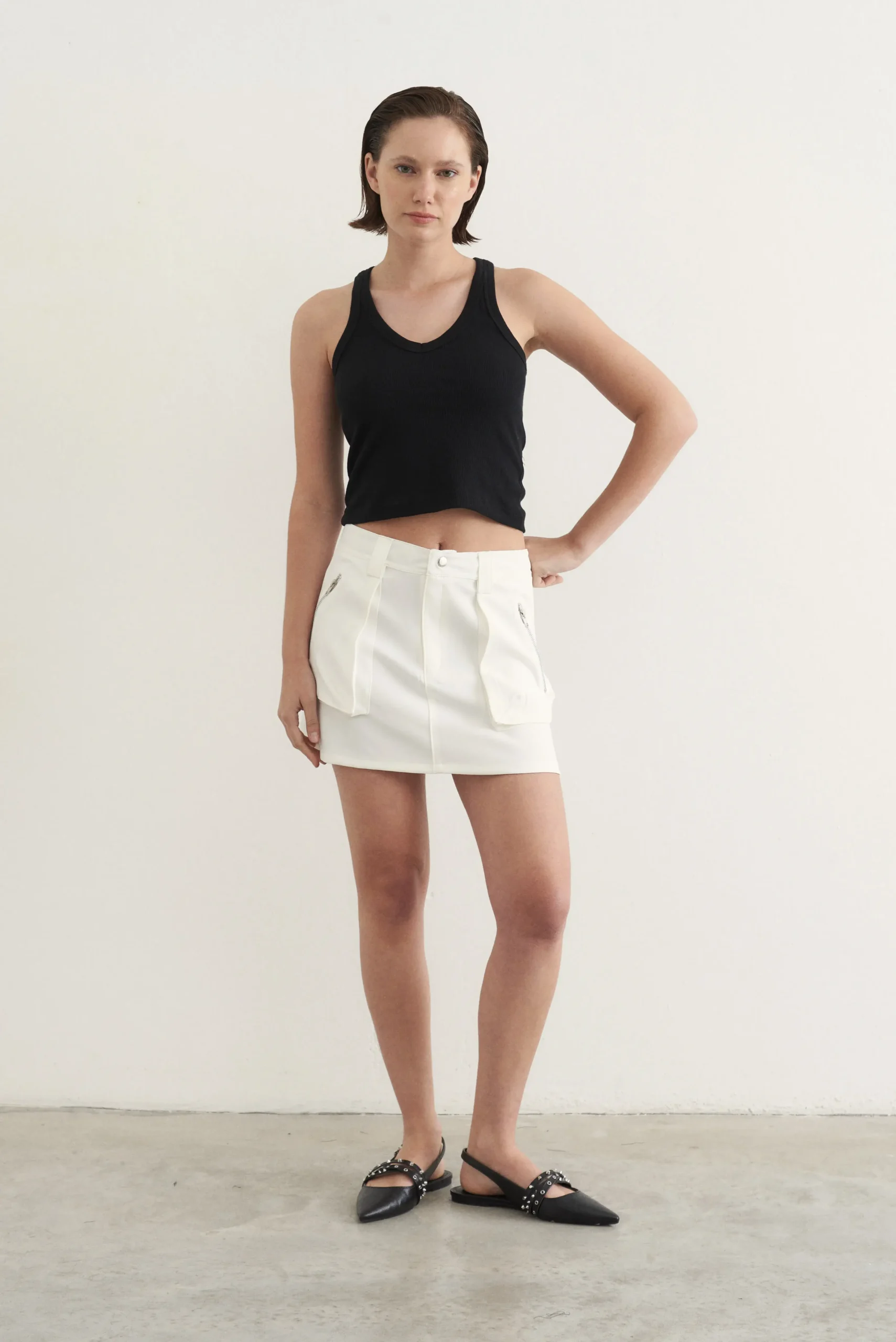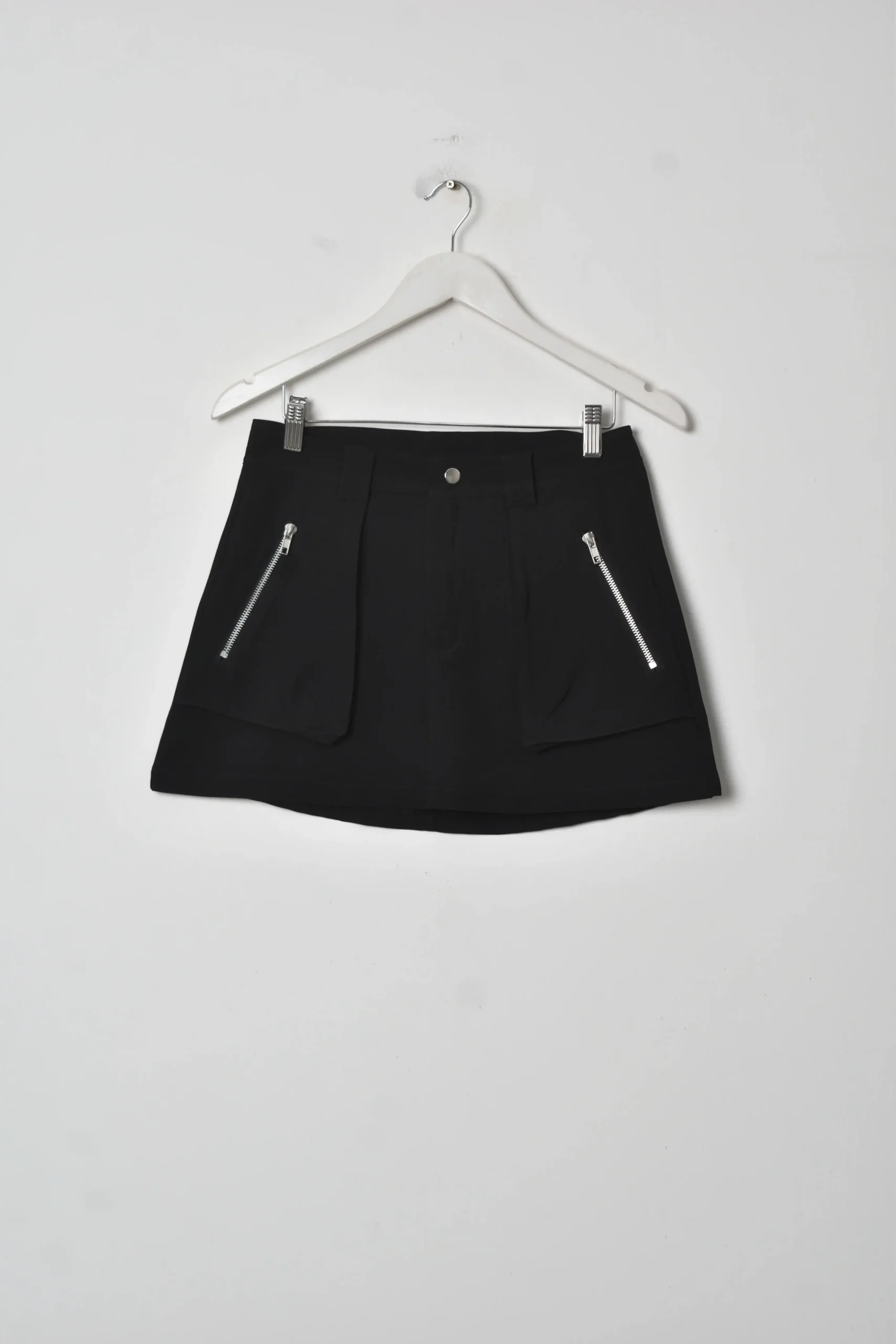 Pollera de crepe sastrero. Con bolsillos tipo cargo con cierre.