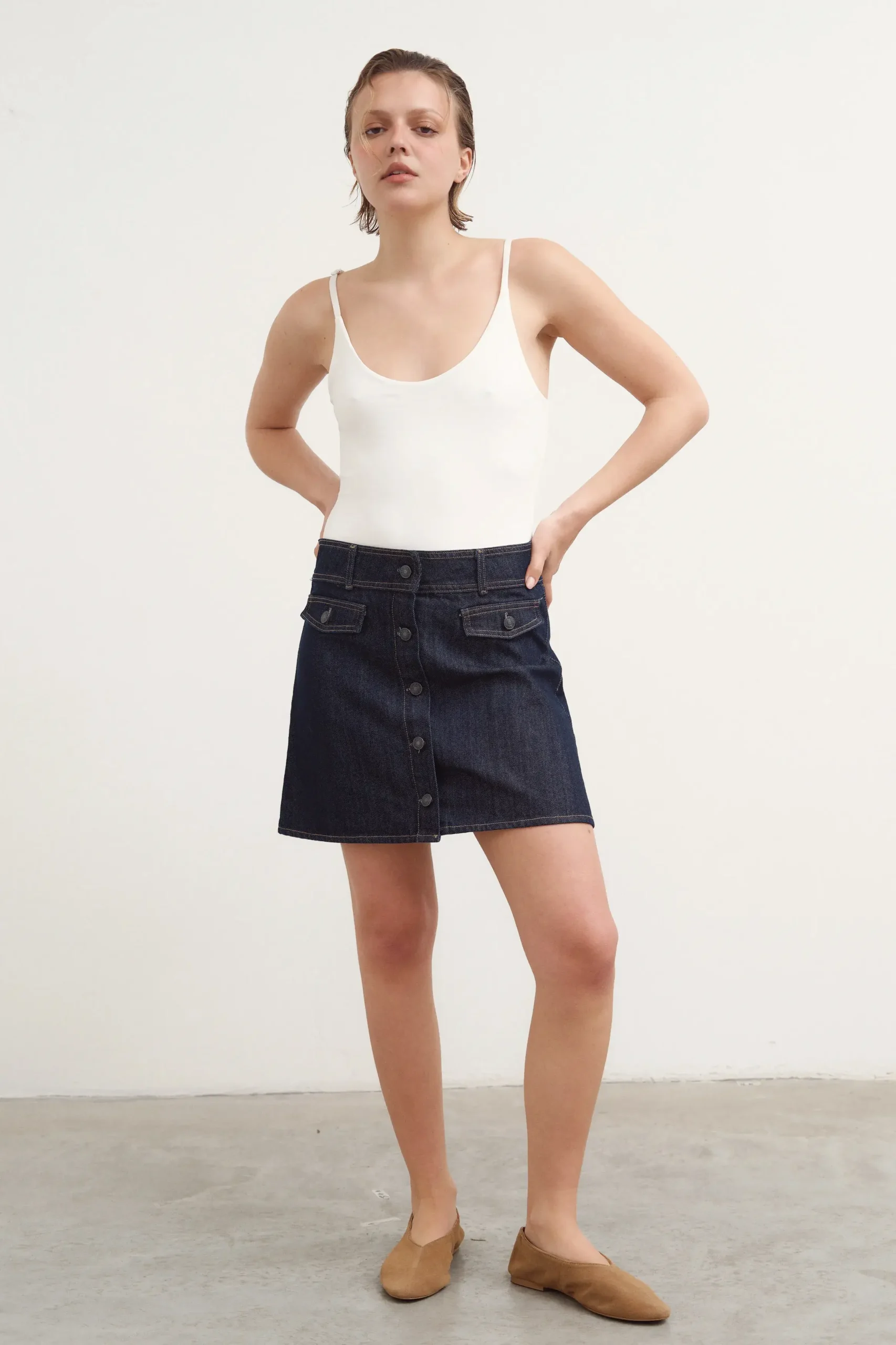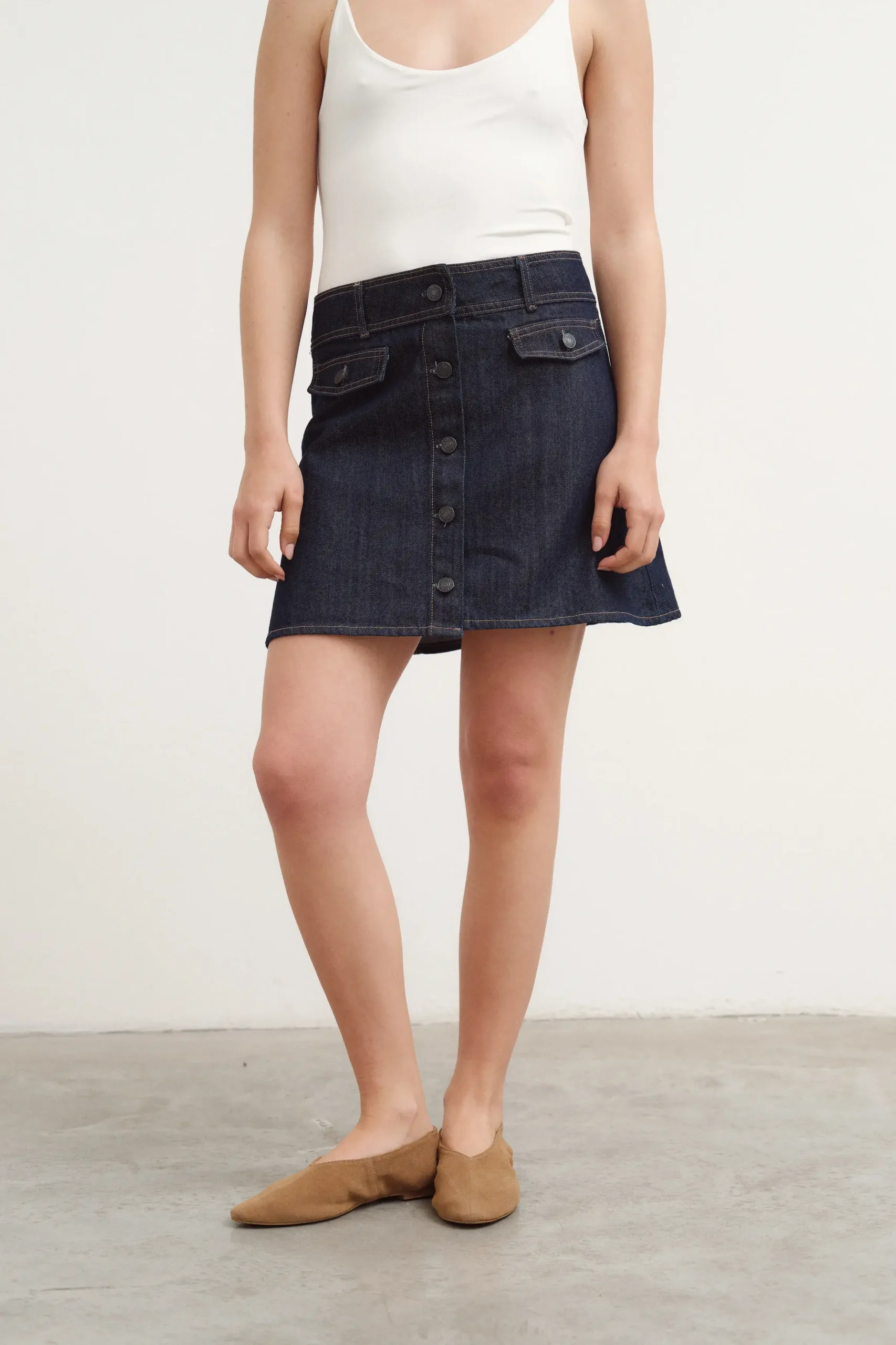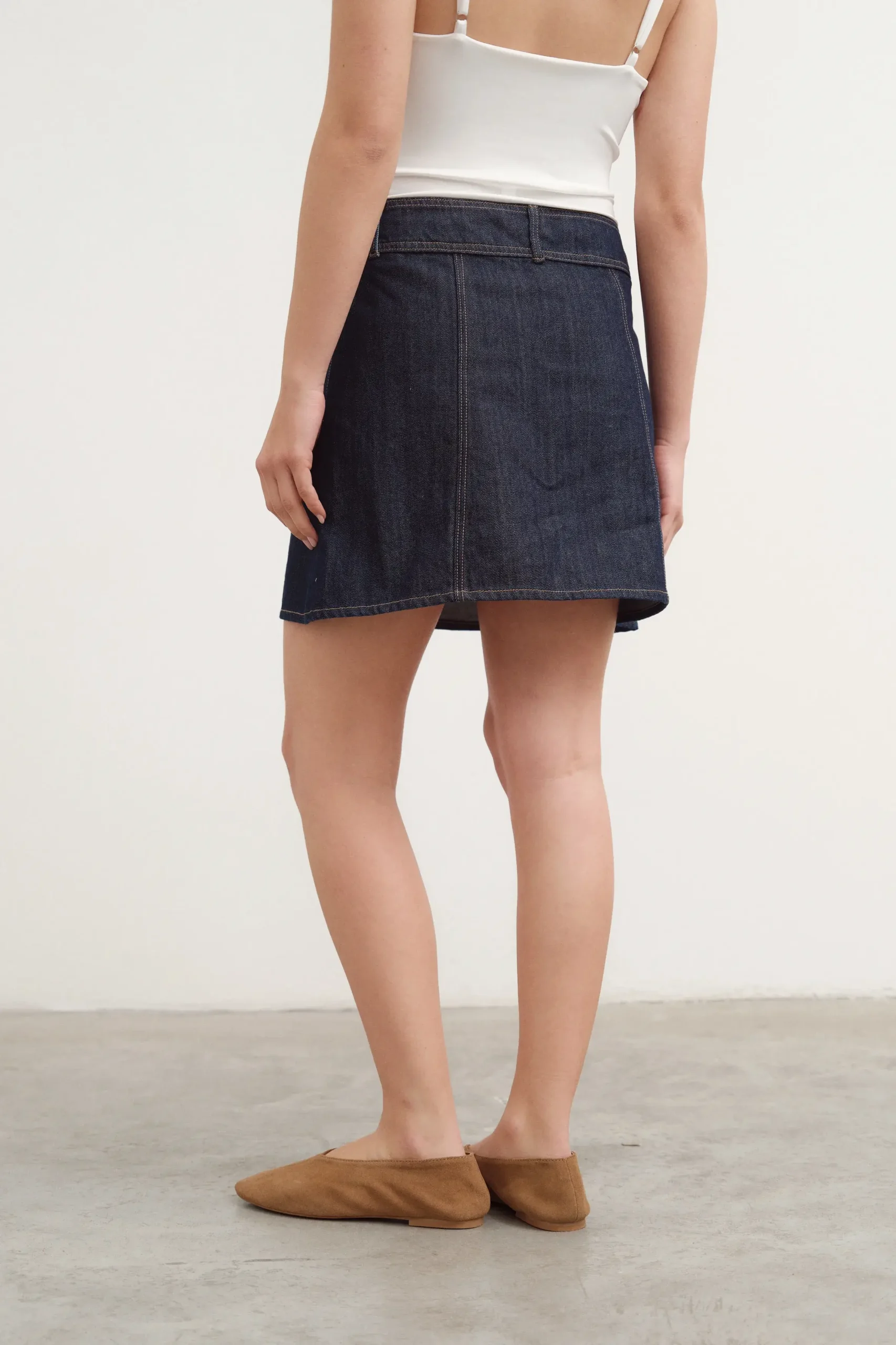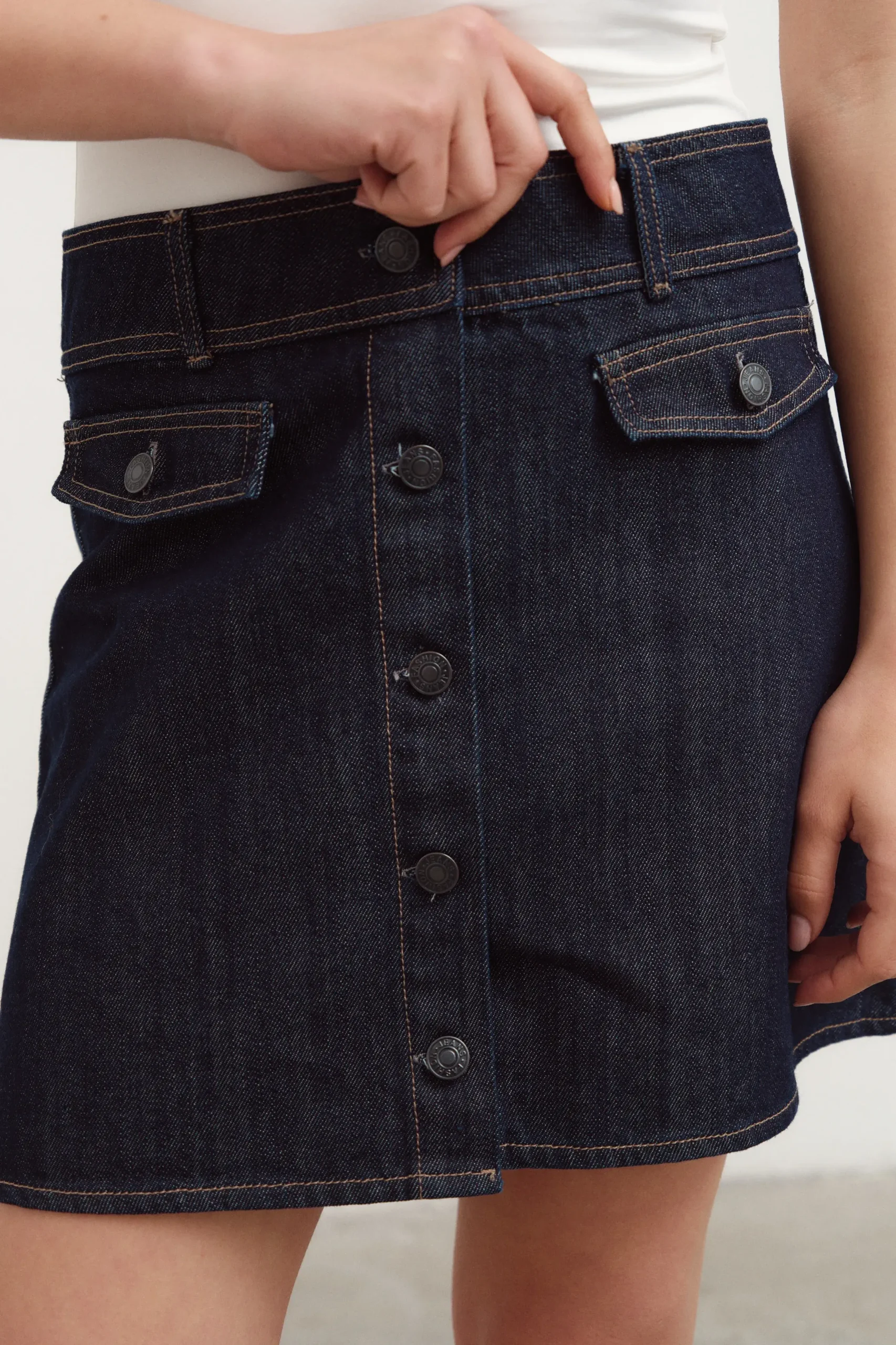Pollera ebase de jean. Tiene botones en la cartera delantera.