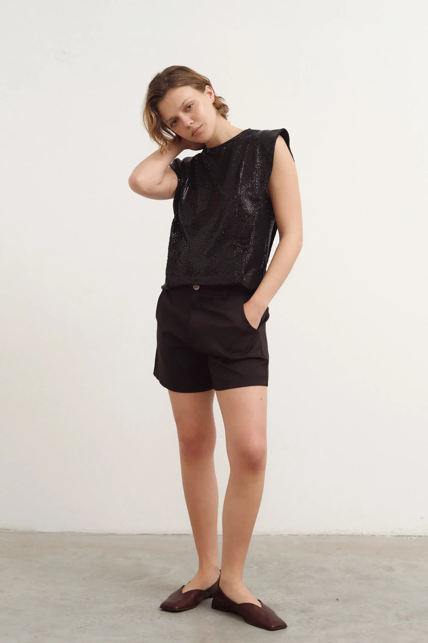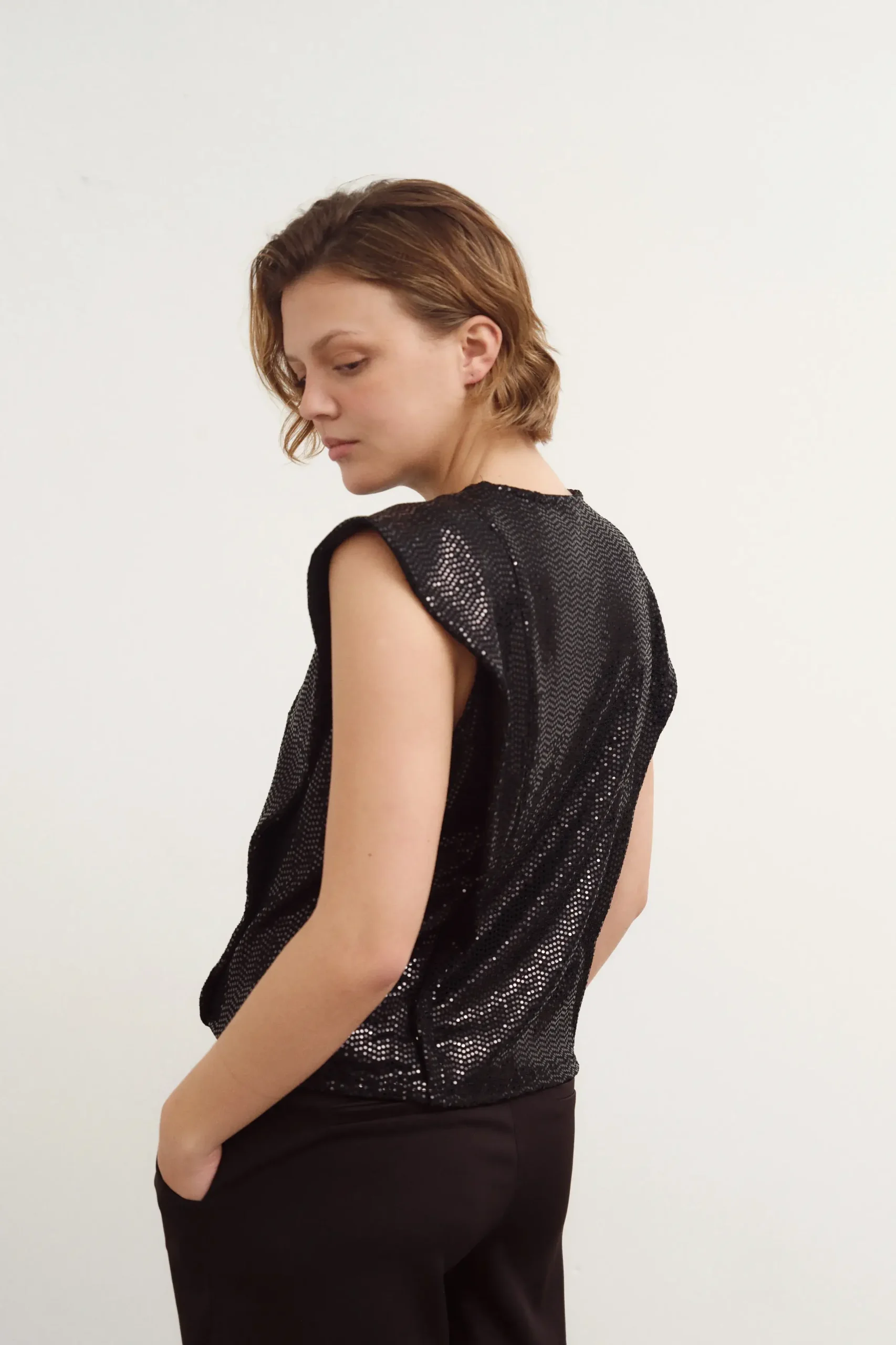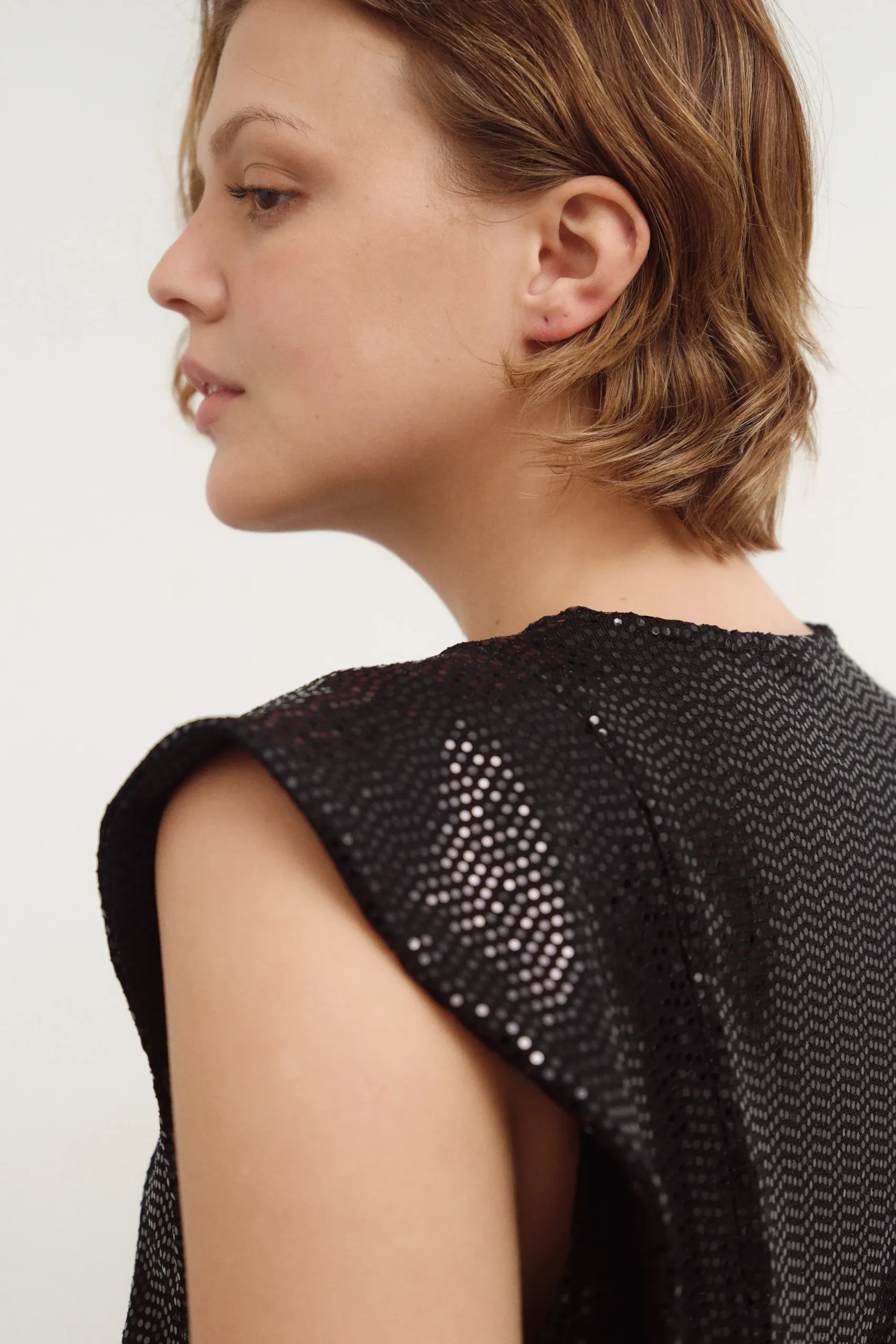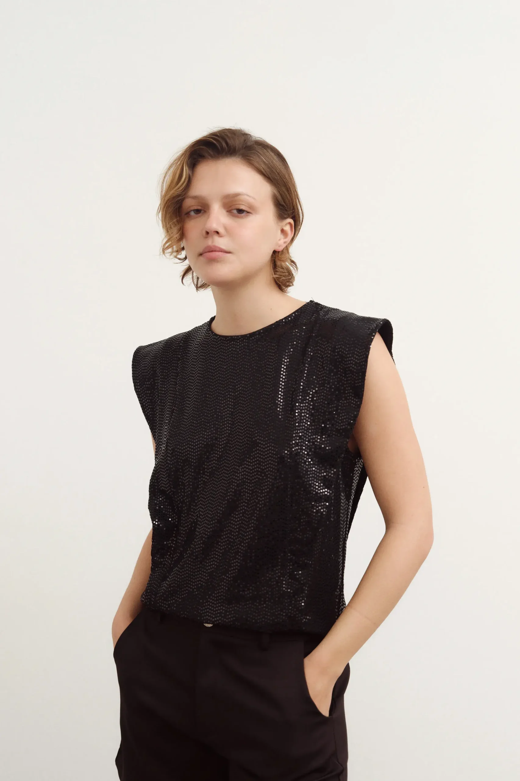 Top de microfibra con lentejuelas. Tiene solapa en hombros.