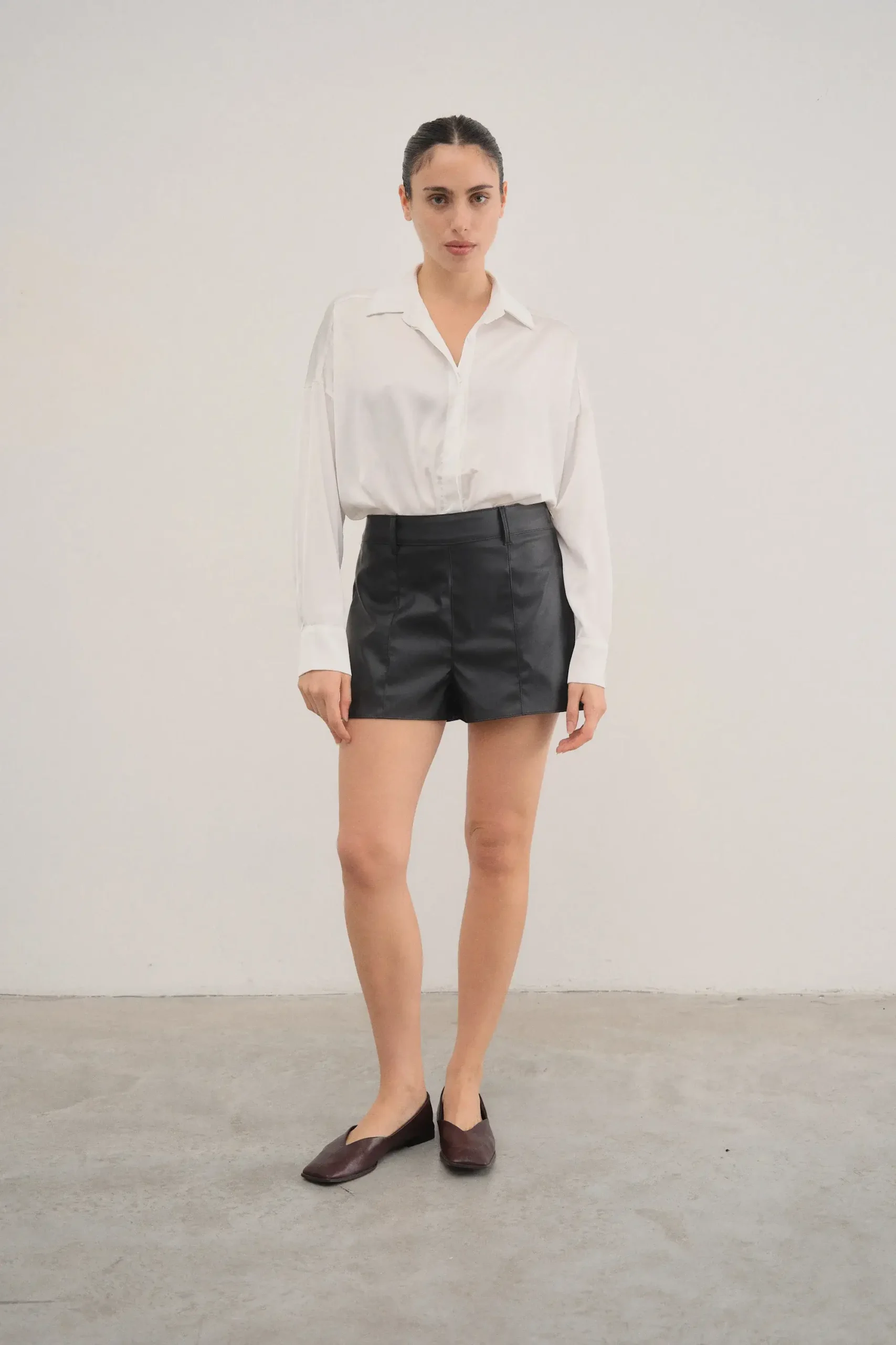 Short de eco cuero. Es corte clásico con tiro medio alto. Tiene recortes delanteros y cierre de costado.