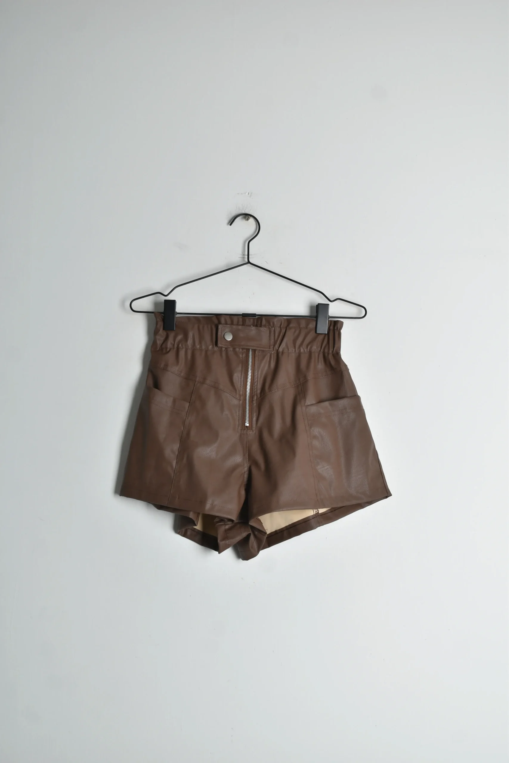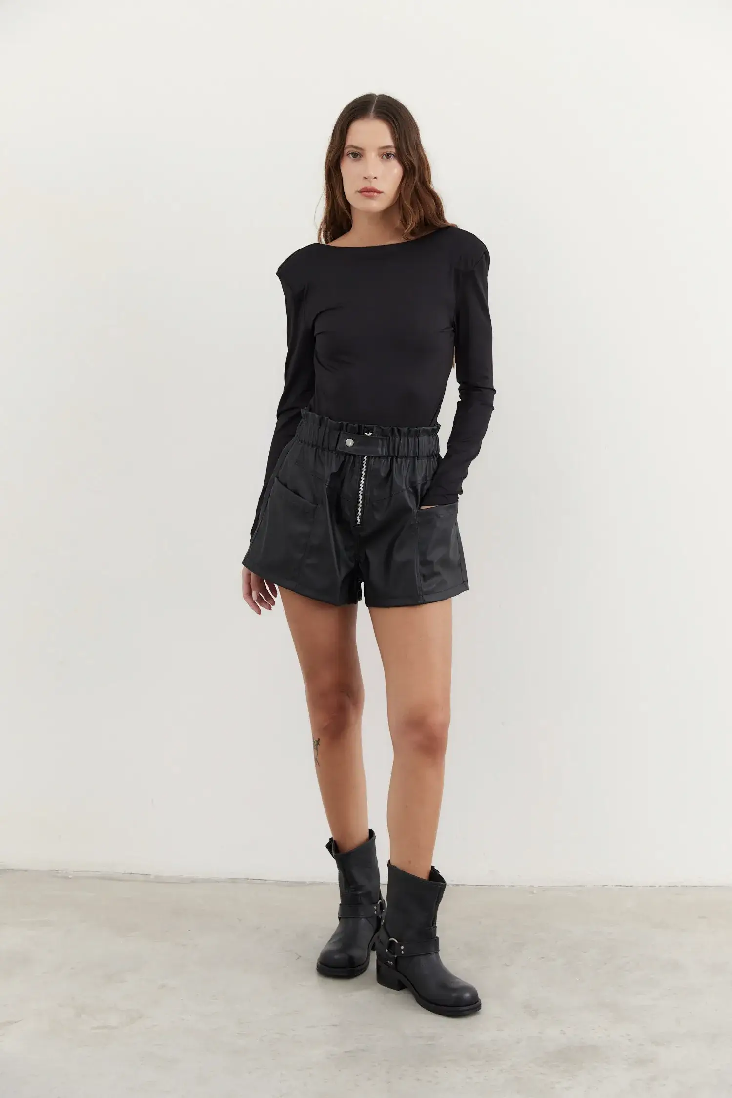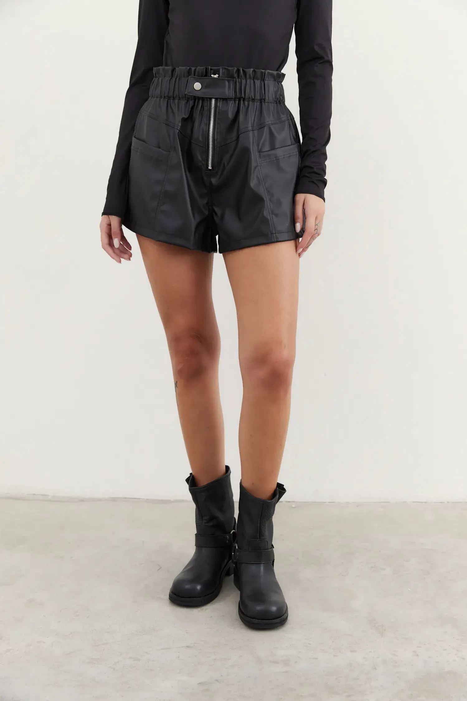 Short de cuerina con elástico en la cintura. Tiene detalle de tira con botón metálico y cierre a la vista.