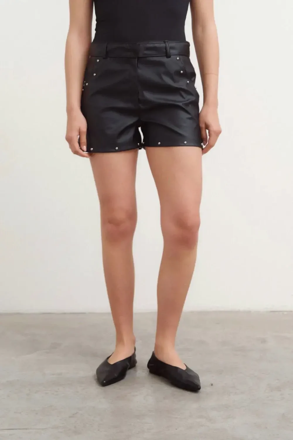Short de cuerina clásico con tachas y botón interno.