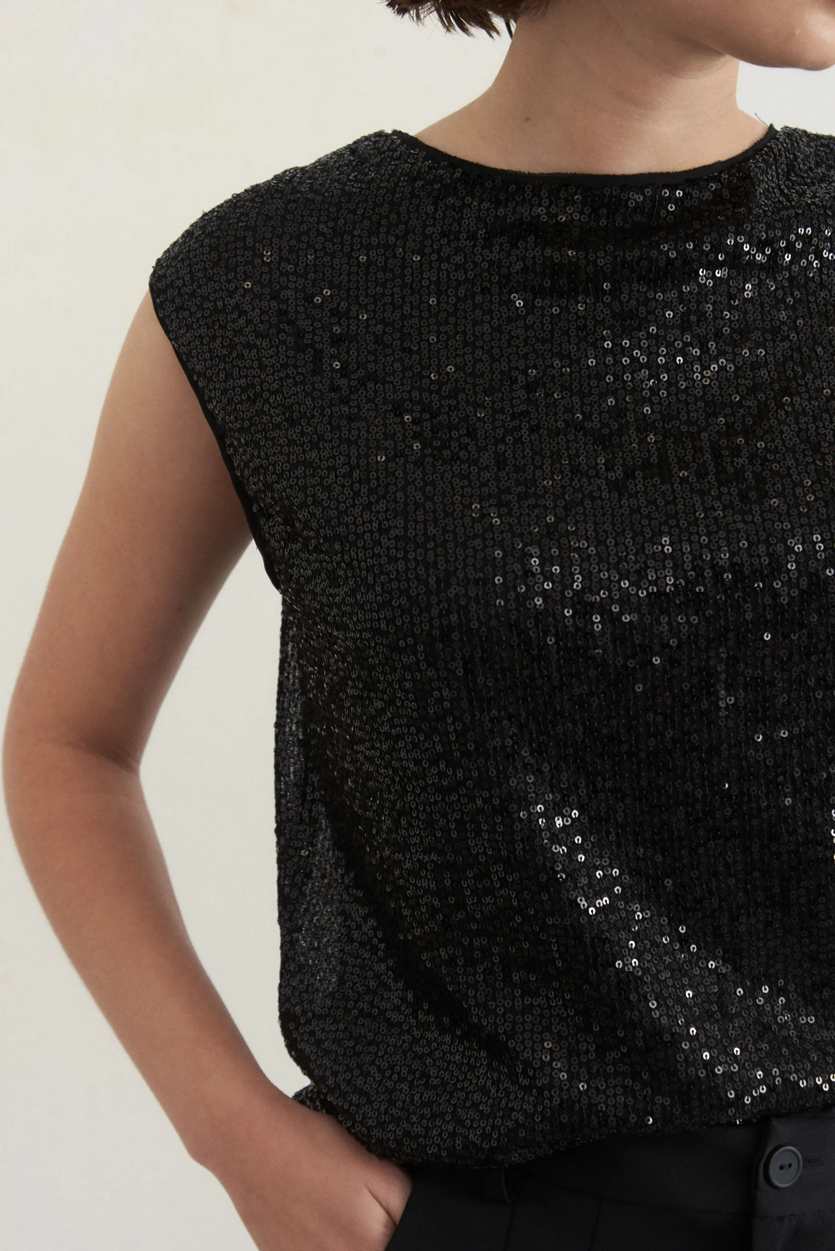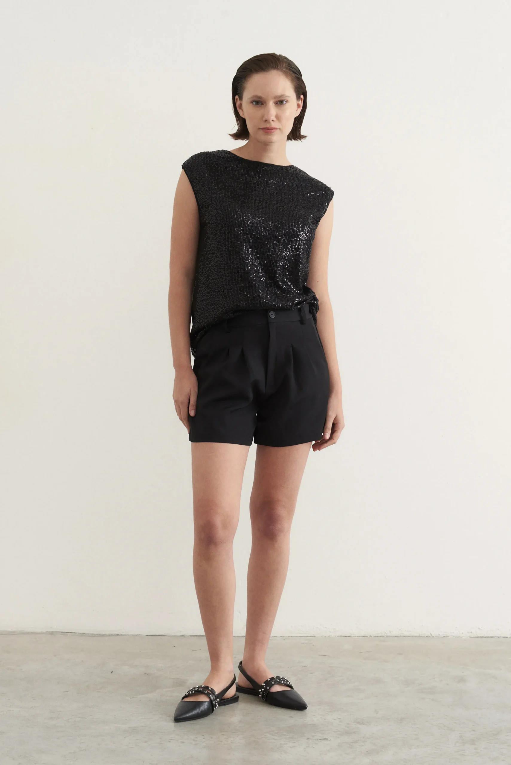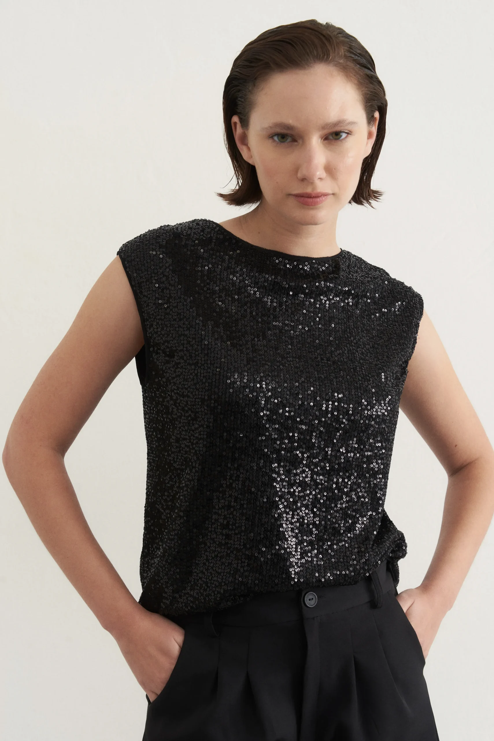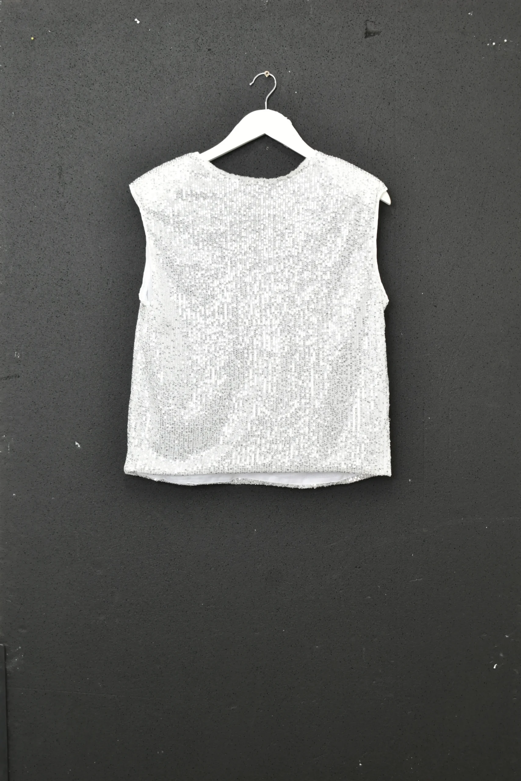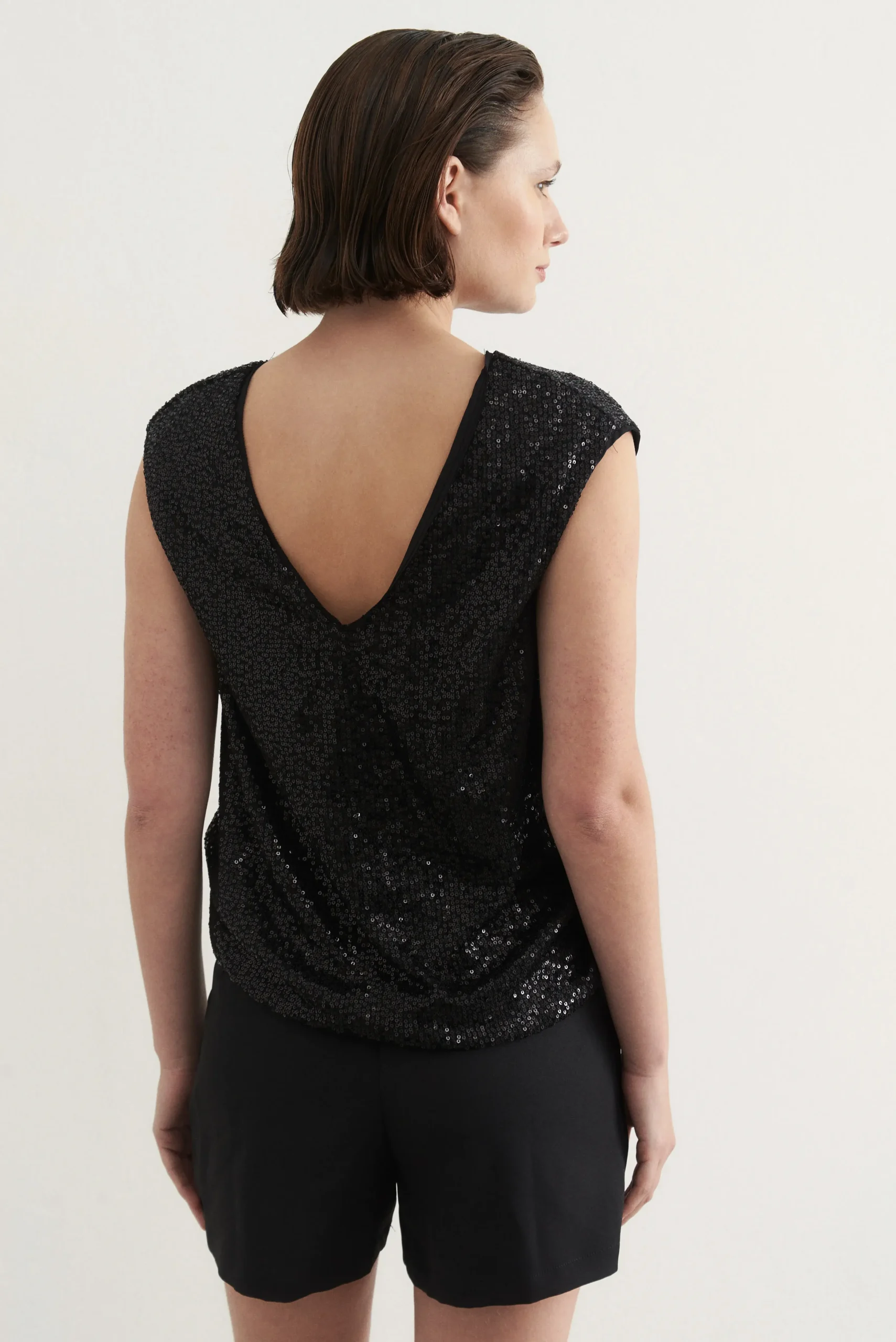 Top de lentejuelas con escote en V. Tiene borde de crepe, hombreras y forreria.